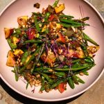 I think the idea stems from a flight I took years ago from San Francisco to Santa Fe, New Mexico. I was sitting next to a young guy, dressed head to toe in hemp, on his way to a spiritual retreat. We started chatting, and he offered me a date from little plastic baggie. He proceeded to tell me the dates were an Ayurvedic staple for him on flights. Massaged with ghee, ginger, and saffron, they weren’t very appetizing in the plastic baggie, but they were a flavor revelation. In my version I soak saffron in a small amount of almond extract, and toss it with melted ghee (or olive oil) and dates. I usually opt out of the ginger. Place the dates in an oven-proof baking dish and broil just long enough for the insides of the dates to get unctuous and tacky. Long enough that the skins start caramelizing. Serve warm. They’re good as part of a cheese spread, or as a sweet bite at the end of a meal – simple with a bit of a wink.